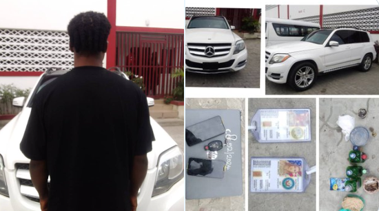 Items recovered from the suspect include one iPhone 11 Pro Max, one Redmi 12 android mobile device, two United States Navy identity cards with numbers 100040041245 and 100010041159, one Mercedes Benz GLK, one HP laptop computer device, and charms.