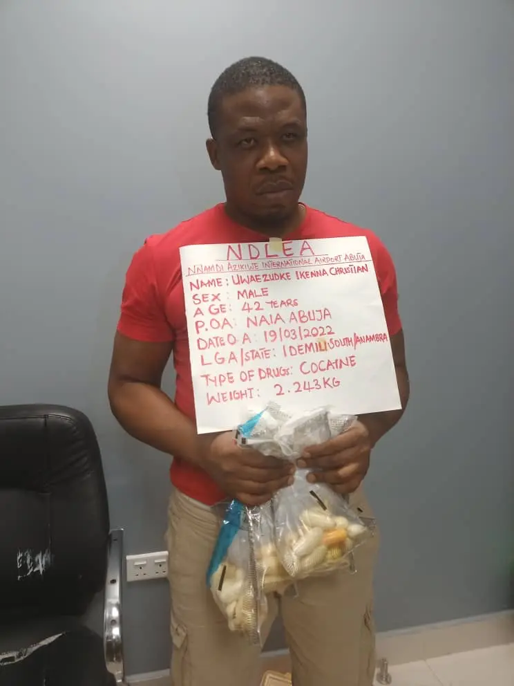 The NDLEA disclosed that Uwaezuoke’s journey to a lifetime behind bars began with his initial arrest on March 19, 2022, at the Nnamdi Azikiwe International Airport in Abuja. He was apprehended during the inward clearance of an Ethiopian Airlines flight from Addis Ababa, Ethiopia, after authorities discovered that he had ingested 100 large wraps of cocaine, totaling 2.243 kilograms.