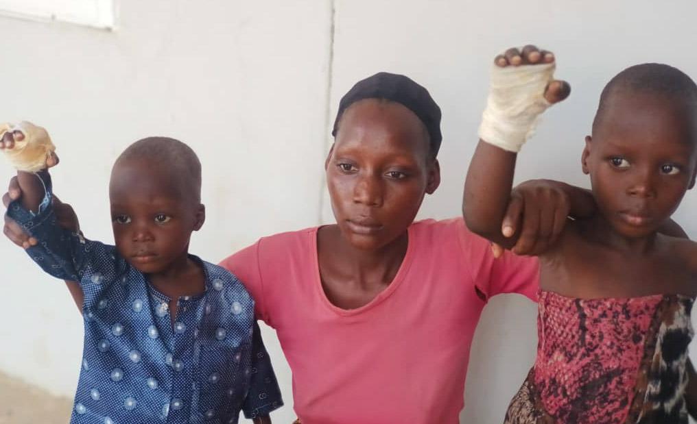 The victims, Genesis Geoffrey, aged seven, and Idadai Geoffrey, aged three, are currently receiving treatment with their hands bandaged as a result of the incident.