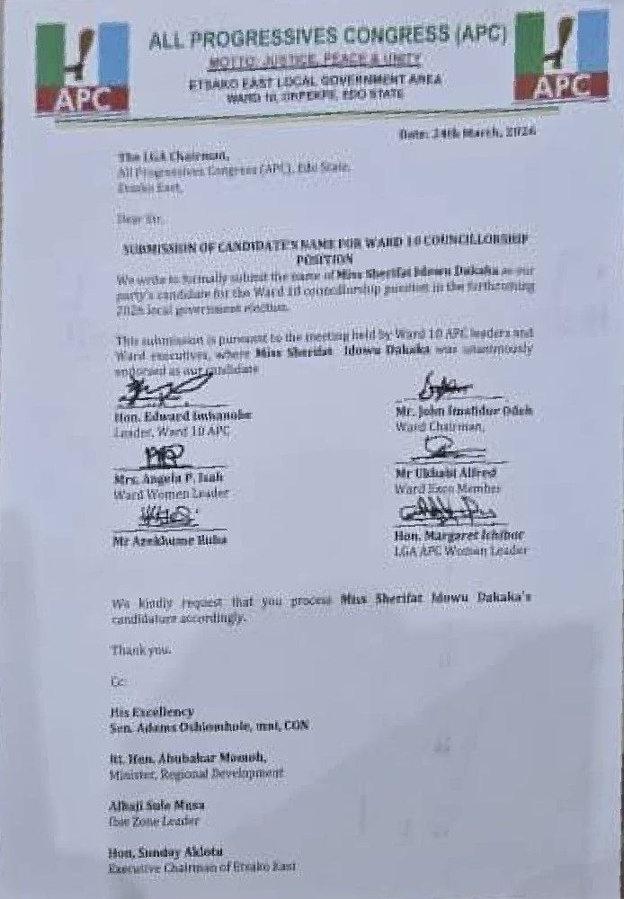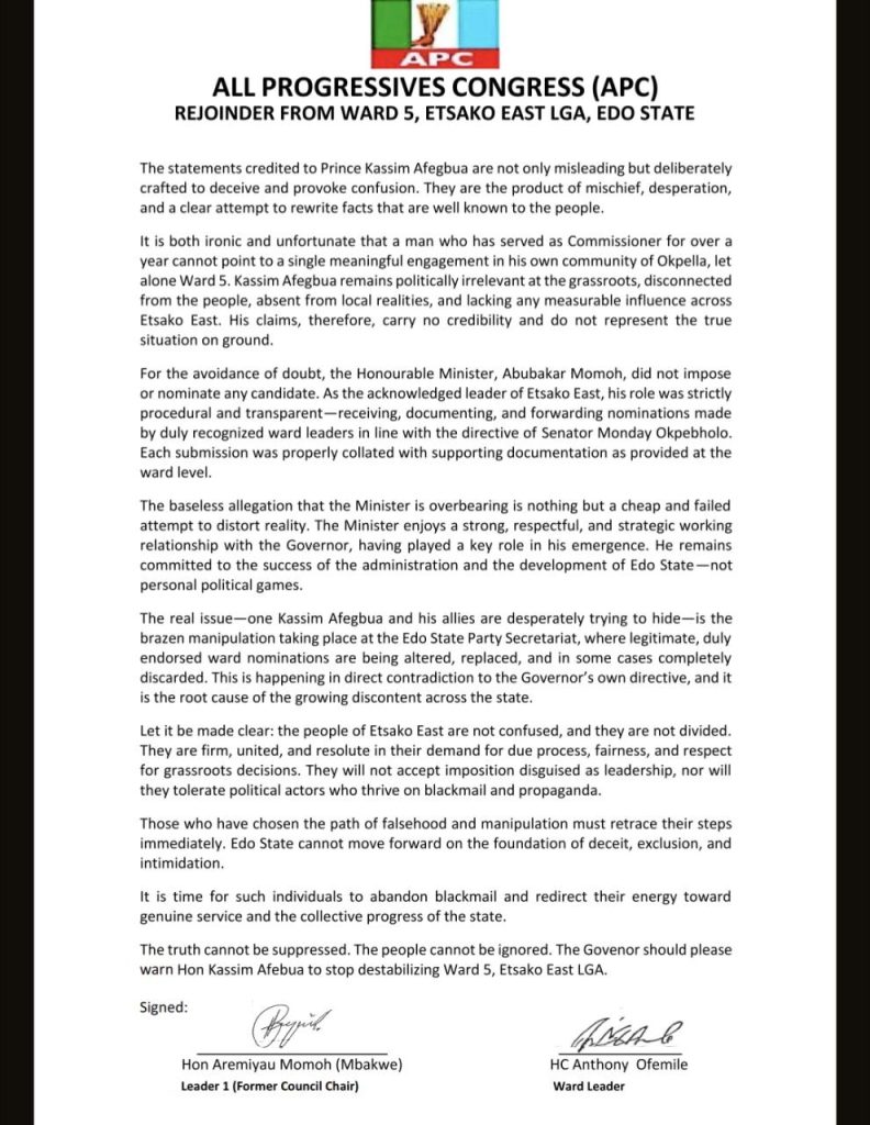 At the center of his argument is the claim that the Honourable Minister of Regional Development, Engr. Abubakar Momoh, imposed councillorship candidates in Etsako East.