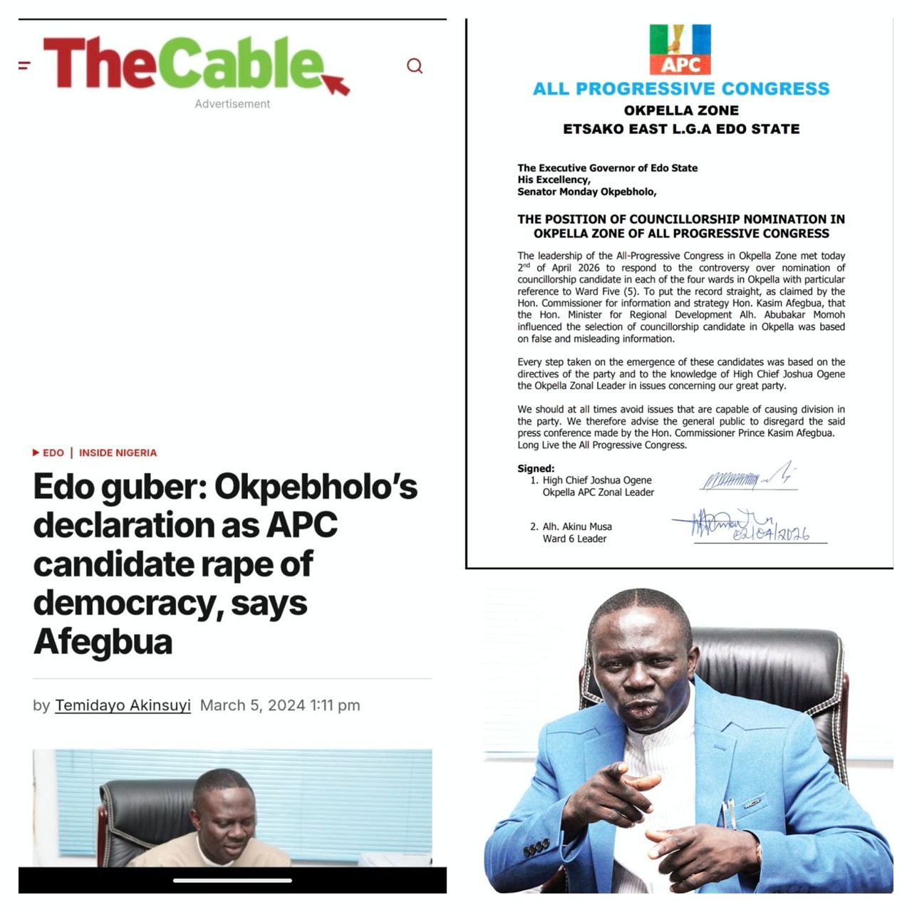 As shown in the screenshot from The Cable, he described Okpebholo’s declaration as the APC candidate as “a rape of democracy,” and he was also seen on national television publicly denouncing his candidacy.
